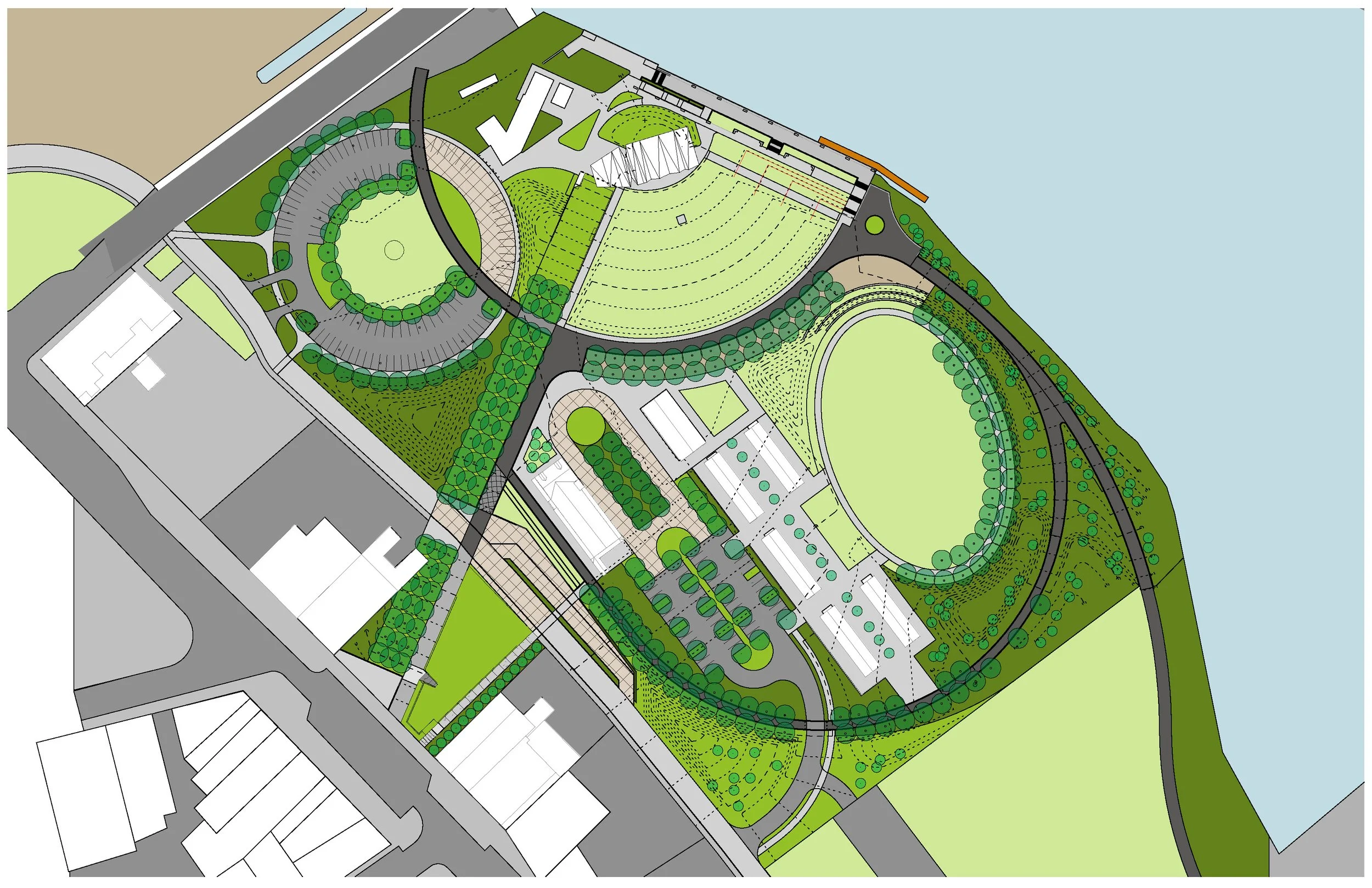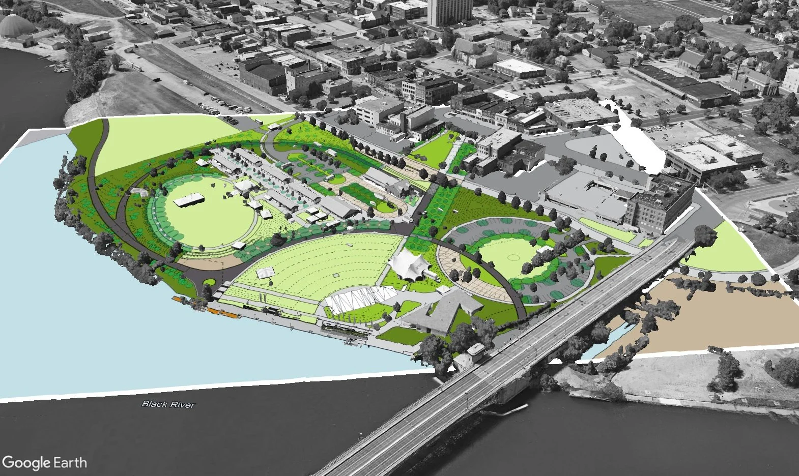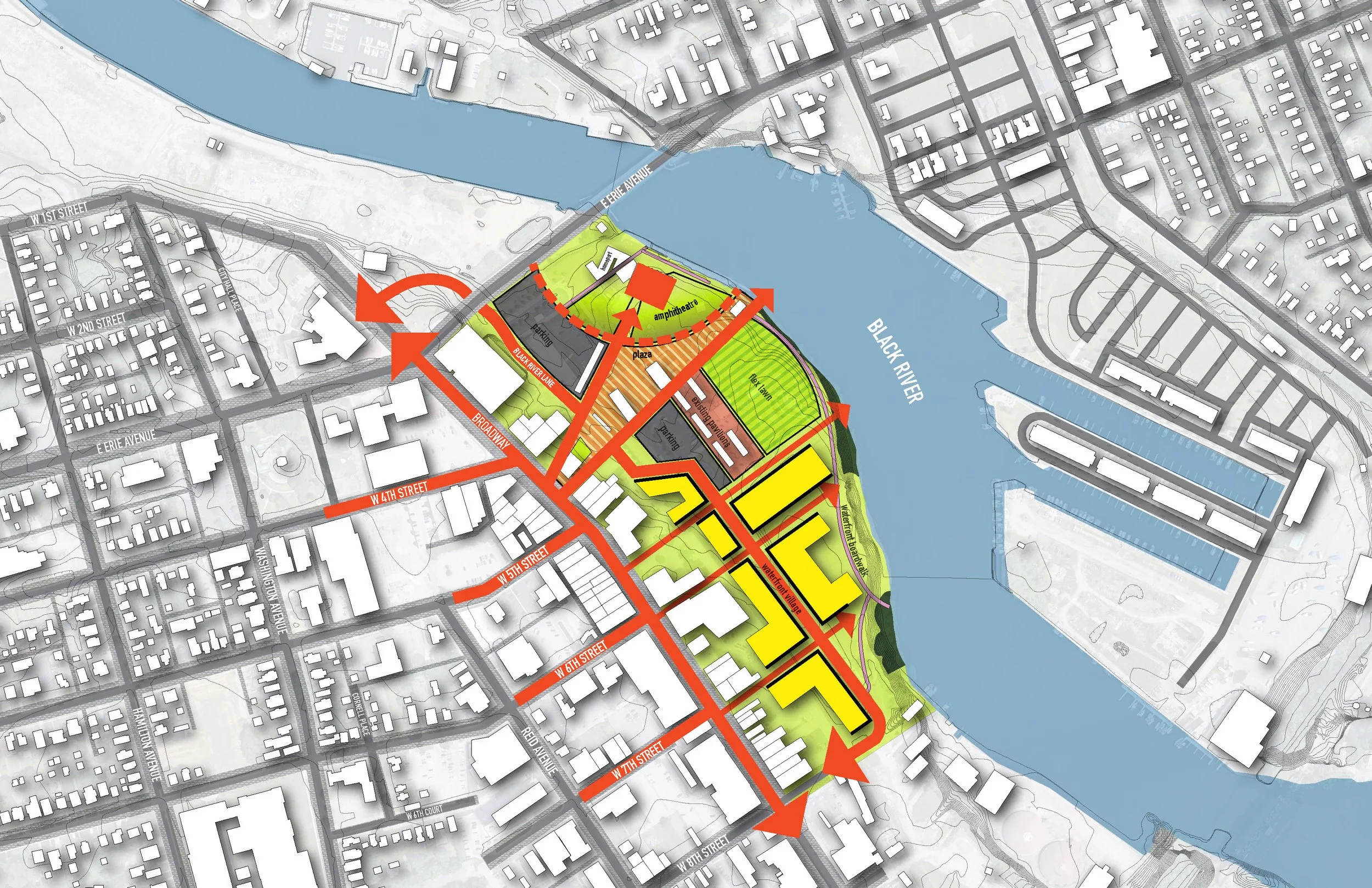 Unlocking Potential: In the heart of Lorain, Ohio, the Black River hold enormous opportunity. REALM was asked to work with the project team to unearth potential within the site to weave together the fabric of the city, creating a seamless connection between the riverfront performance area and the bustling main retail street. This would result in synergy that breathes life into both spaces, fostering a sense of cohesive village.