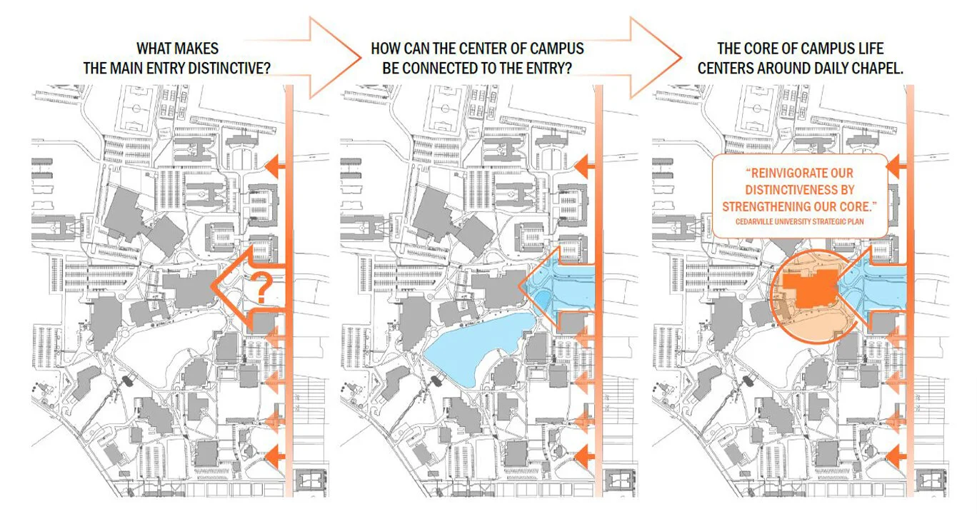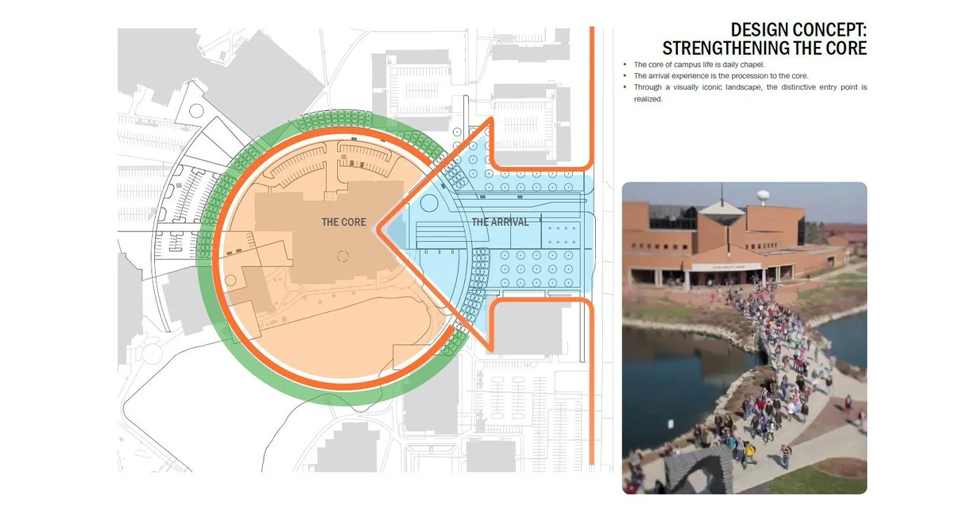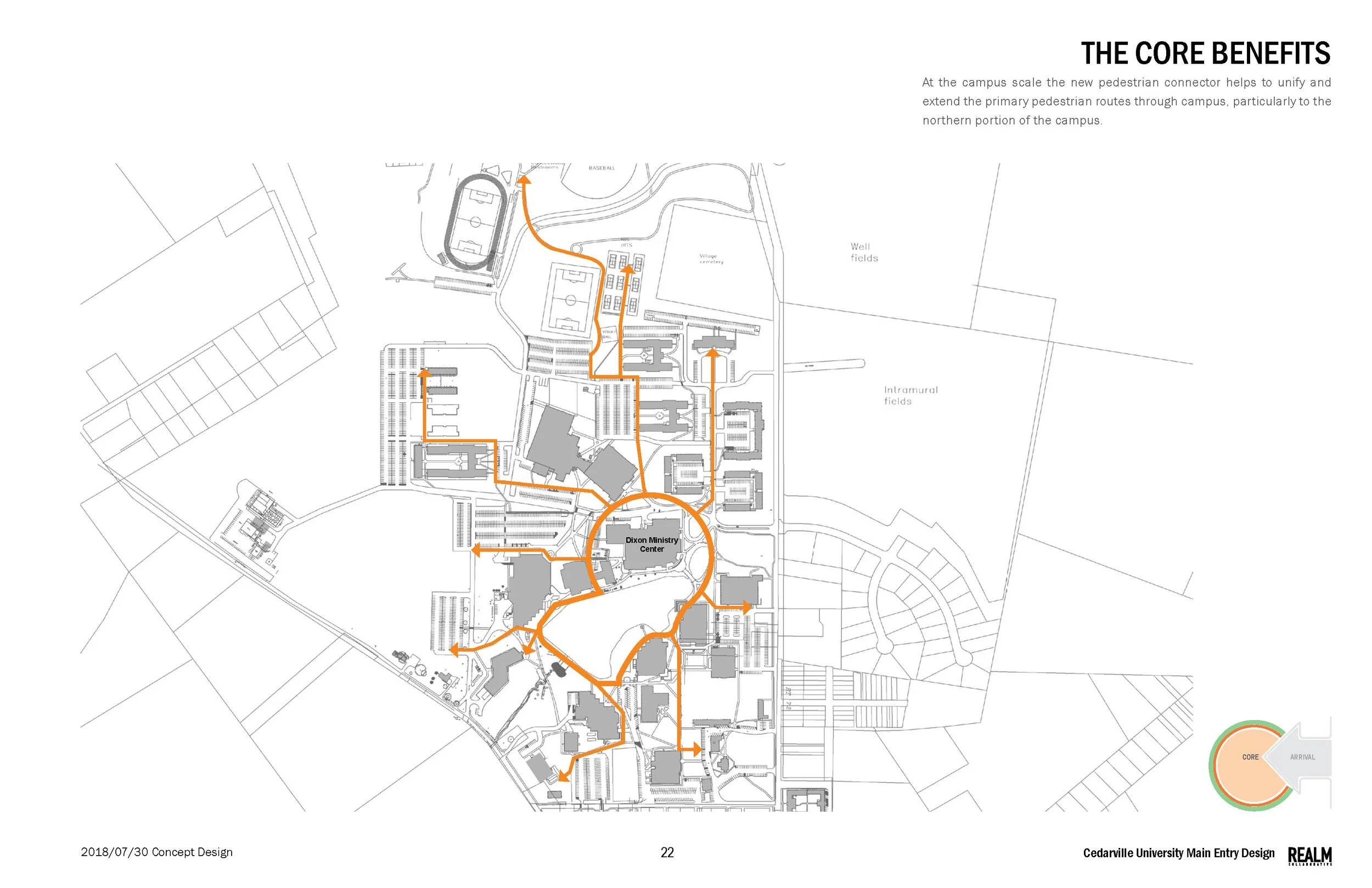 Connecting the campus: As a faith-based university, attending daily chapel services is a major part of student life at Cedarville University. REALM proposed the creation of a campus core that both gave physical and figurative meaning to this central part of the campus. Walking patterns of students throughout campus influenced a circulation pattern that walks purposely around and through this campus core. Places where students visit most frequently will be connected in a distinct and intentional way. Solving for both pragmatic as well as experiential needs, the new campus plan provided a road map for shaping a more defined campus environment.