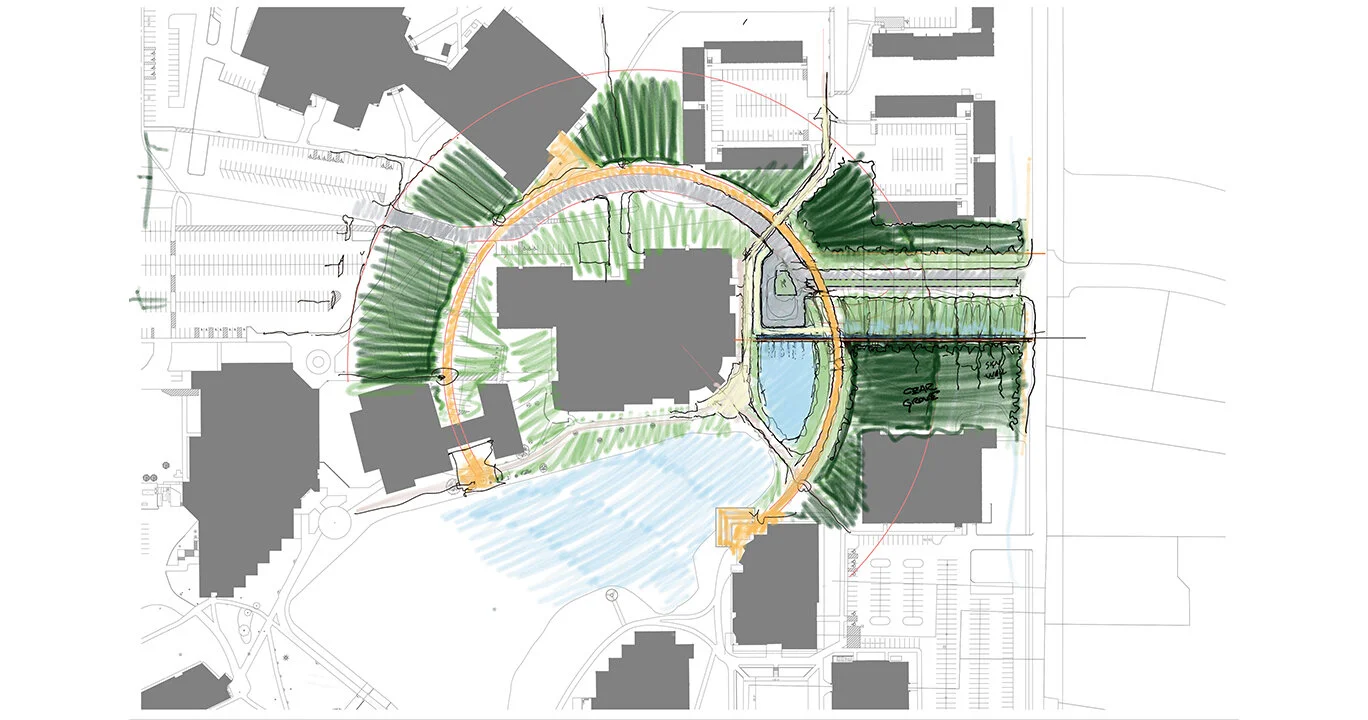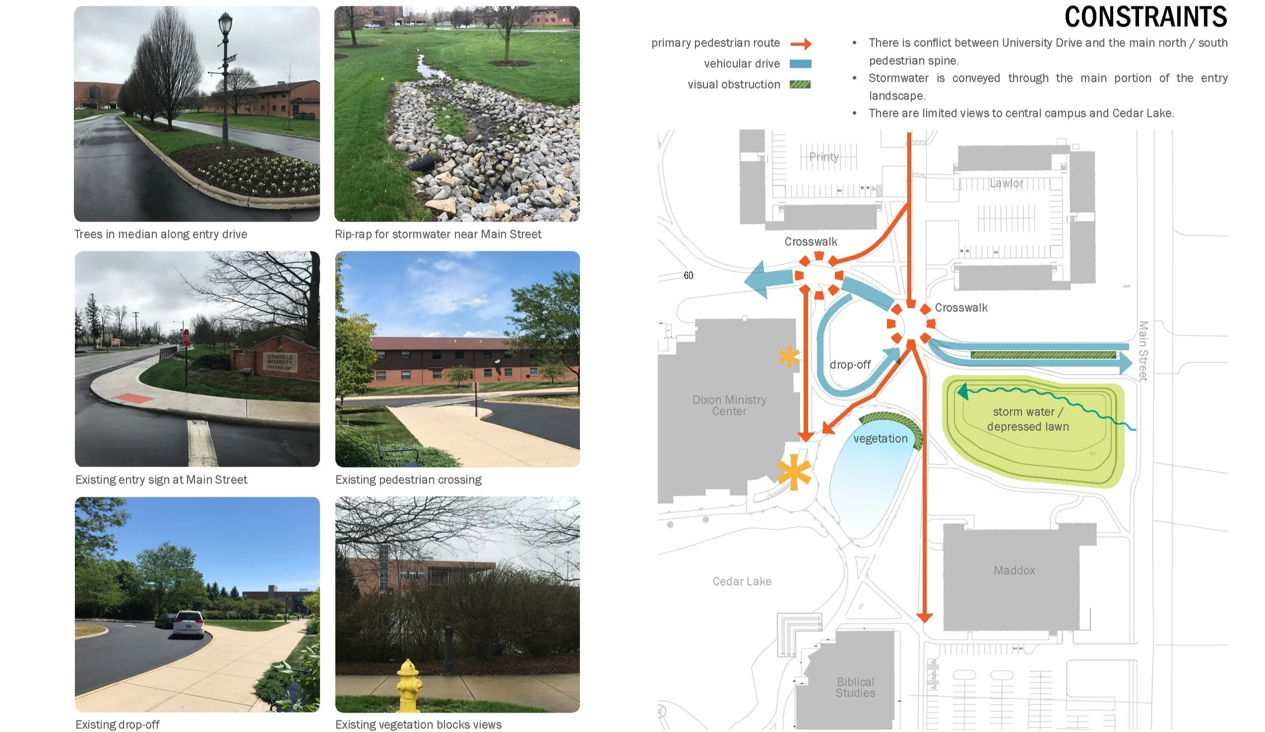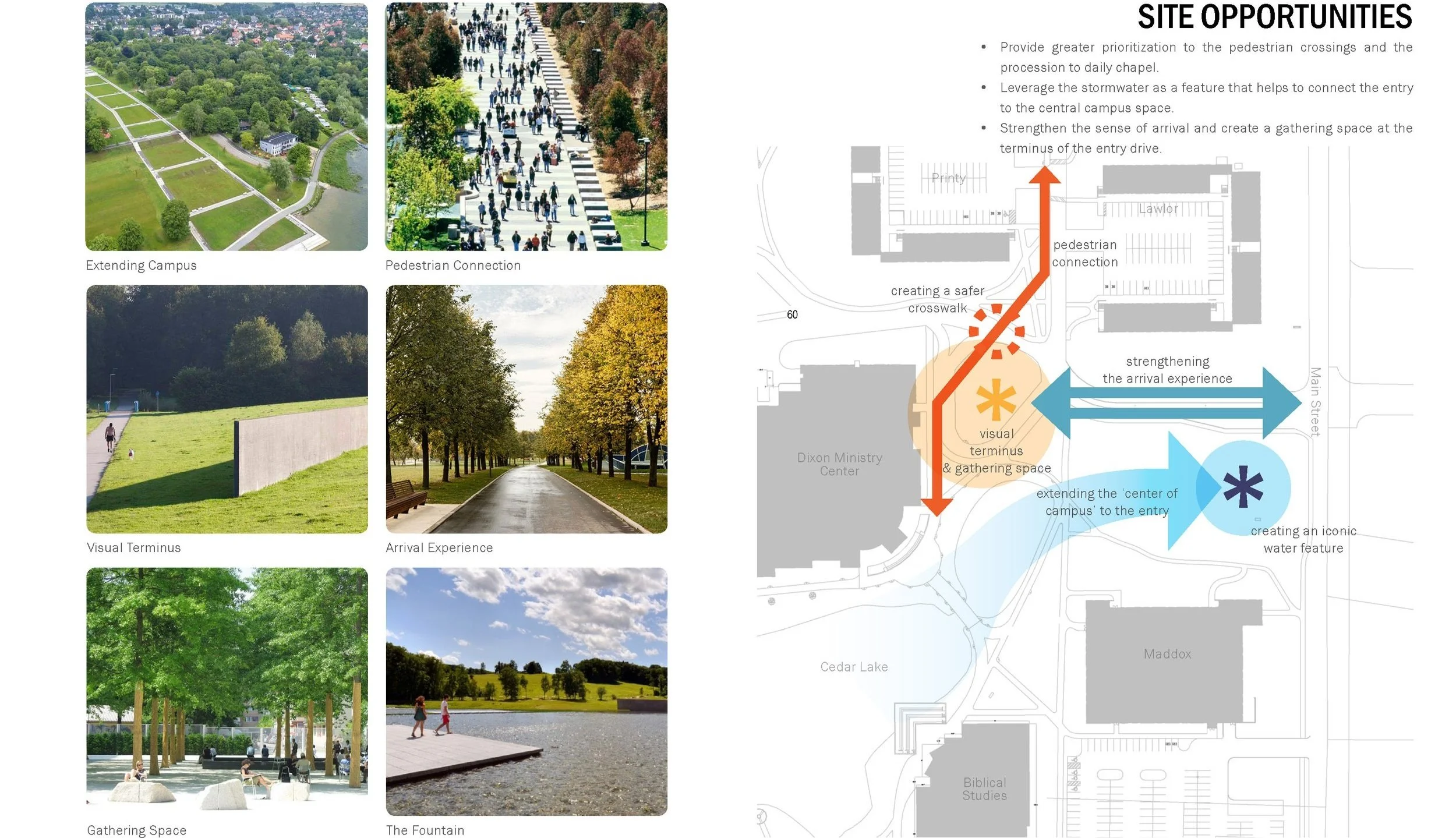 Defining a space: Cedarville University was seeking to better define their sense of arrival to their campus as well as identify a campus spatial hierarchy. REALM provided a broad strategy to better organize vehicular and pedestrian circulation for more intuitive wayfinding that also shaped a unique character specific the university’s culture. By both signalizing the main entry of University Boulevard through a linear water feature and allée of trees, the design team built a strong vision for the future of the campus. REALM also provided a comprehensive site planning strategy to better connect campus asssets.