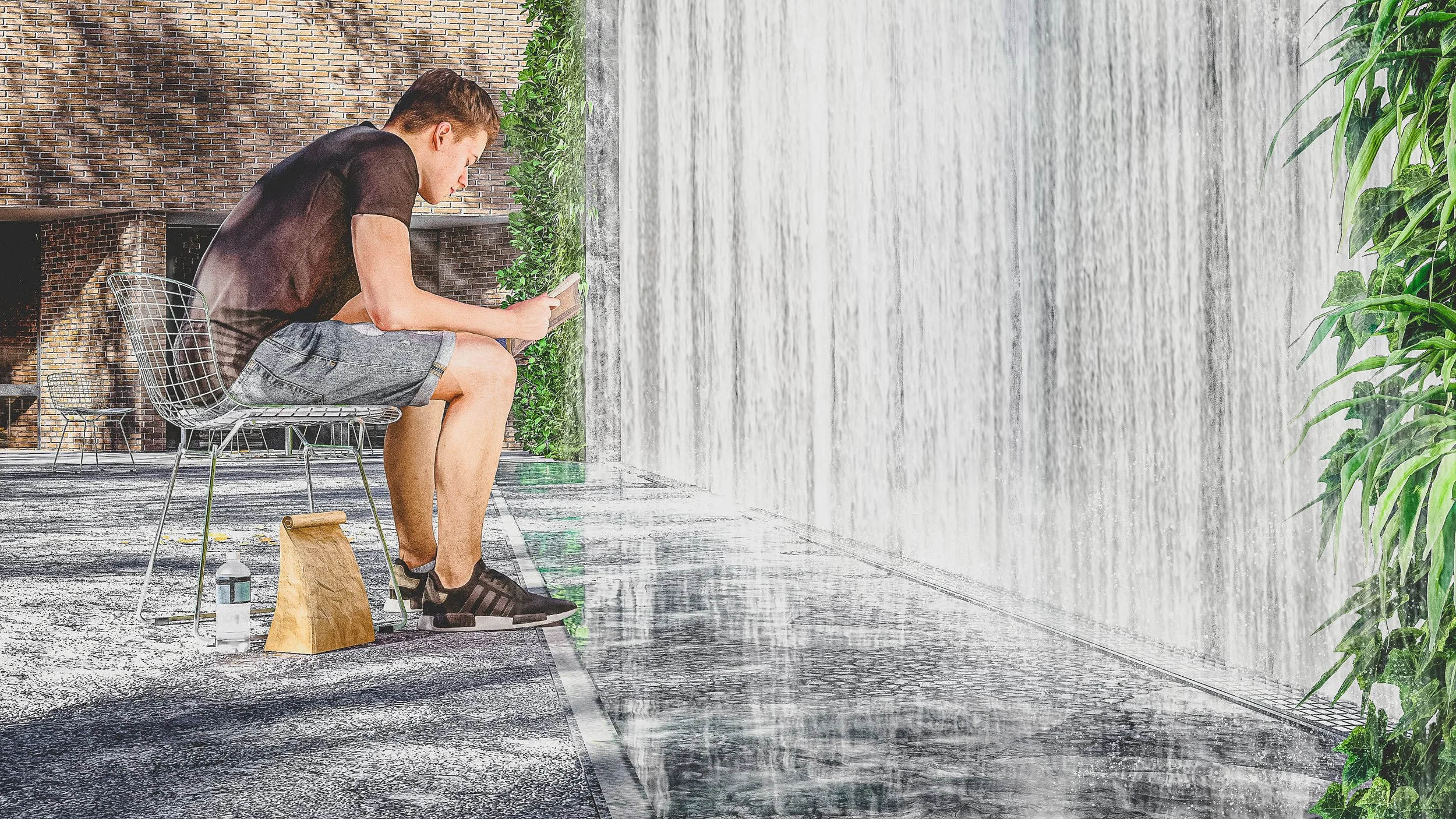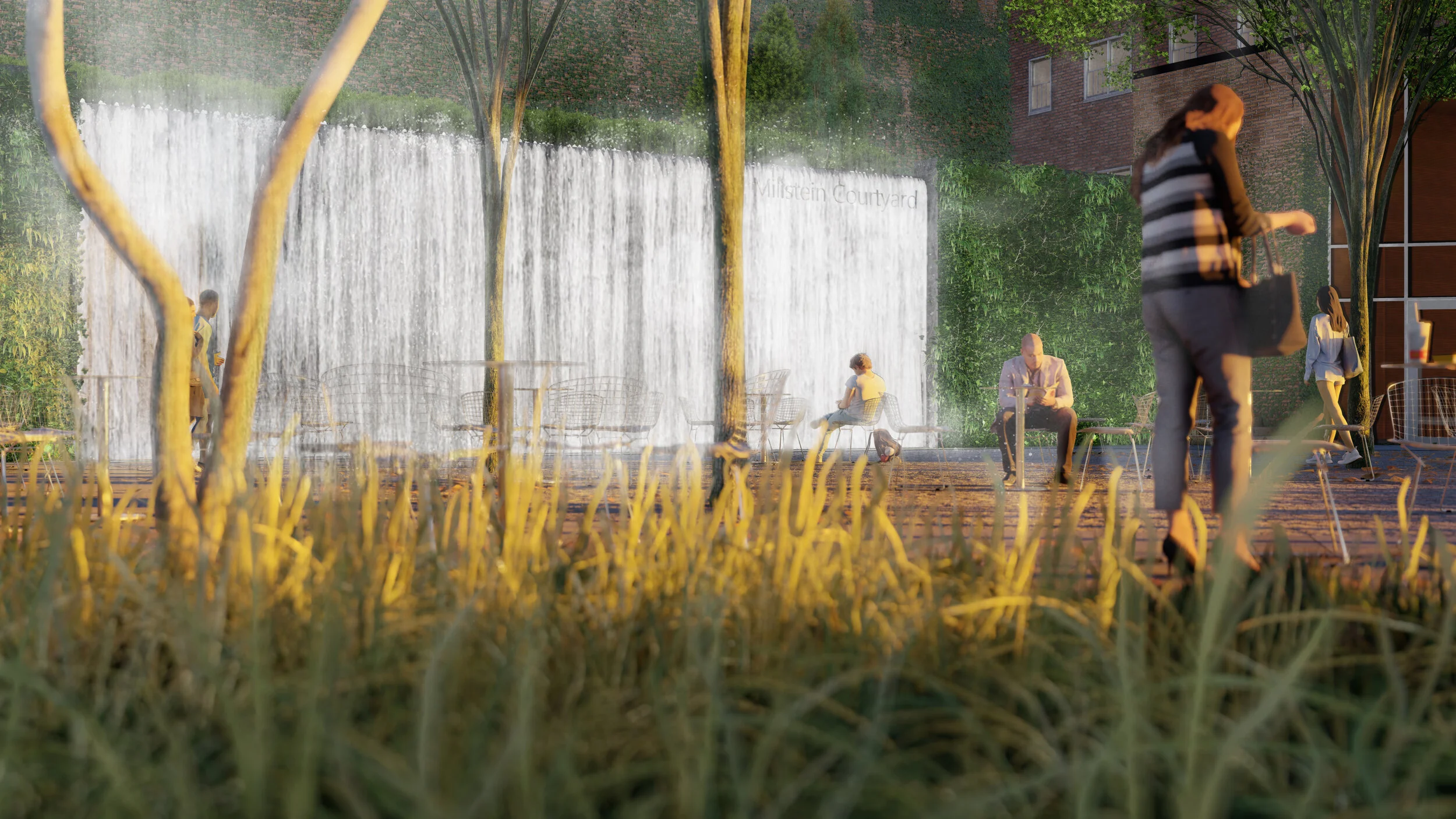 Creating an oasis: REALM conceptualized the central courtyard as a sunken oasis—a sanctuary nestled within the bustling campus environment. At the heart of this vision lies a striking water wall, designed to serve both auditory and visual senses. The gentle murmur of flowing water provides a soothing backdrop, inviting visitors to pause, reflect, and recharge. The water wall becomes a captivating centerpiece, drawing attention and fostering a sense of wonder.