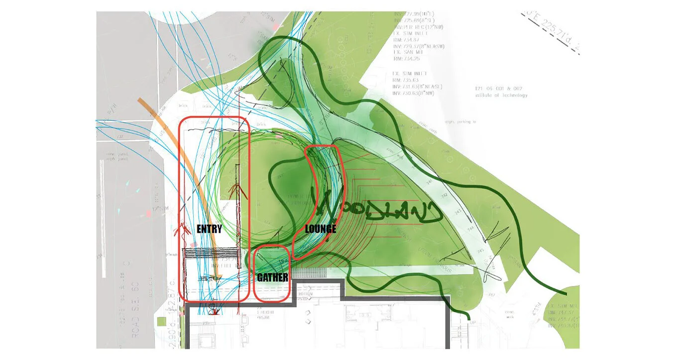 Plaza space: In collaboration with the architect, what was once the service area of the building was replaced with a glassy façade that helps to visually connect interior and exterior social spaces for students. The indoor café space was designed to spill out onto a small gathering plaza with movable tables and chairs. A more permanent seat wall was clad in reclaimed wood to help transition grade while also providing a shaded area for respite.