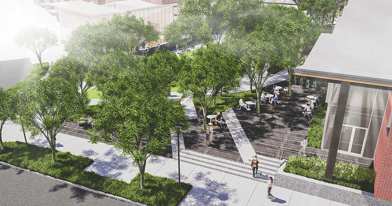 Public spaces for students: As part of a much needed building renovation, this project transformed a leftover campus space in the center of a lively residential district. The existing building was the product of a former era that insulated the campus from its surrounding neighborhood context and served as a dining commons. A complete renovation of the building creates the opportunity to engage its adjacent surroundings creating a lively public space. By leveraging existing topography, a series of stepped plazas create various opportunities for seating, dining and studying.