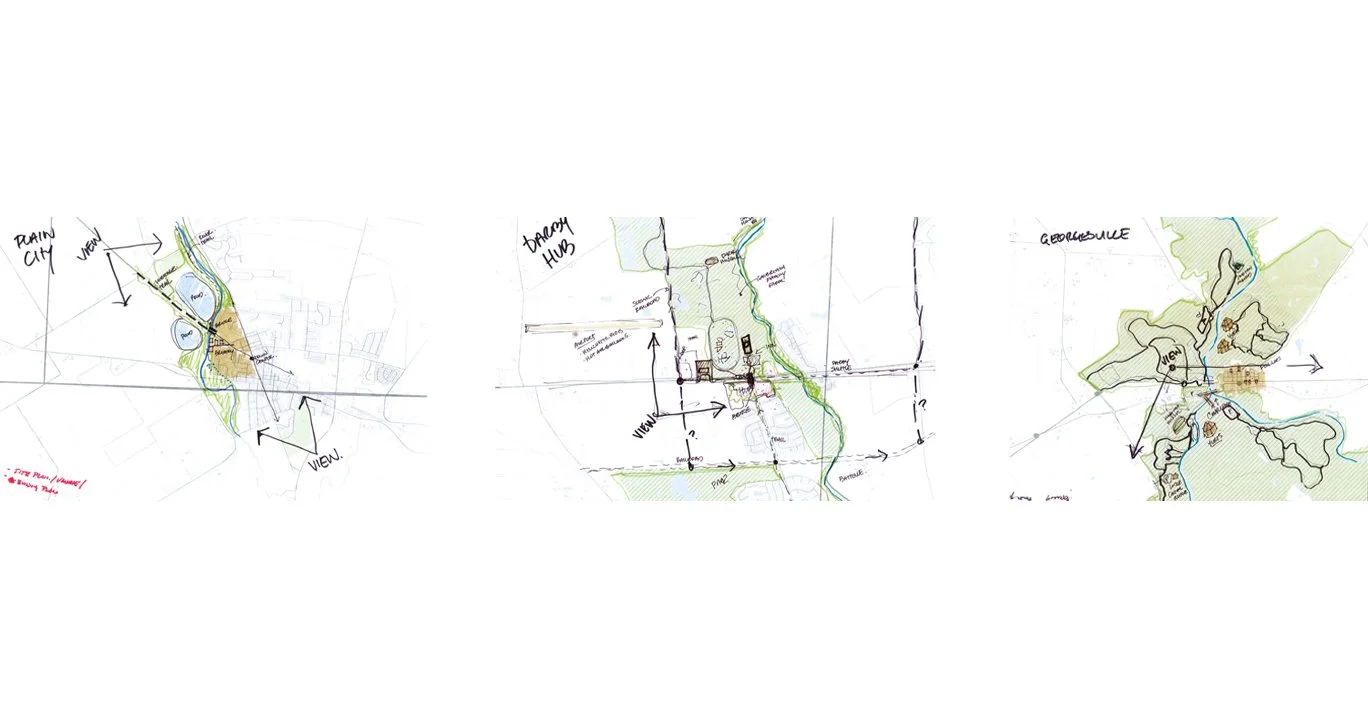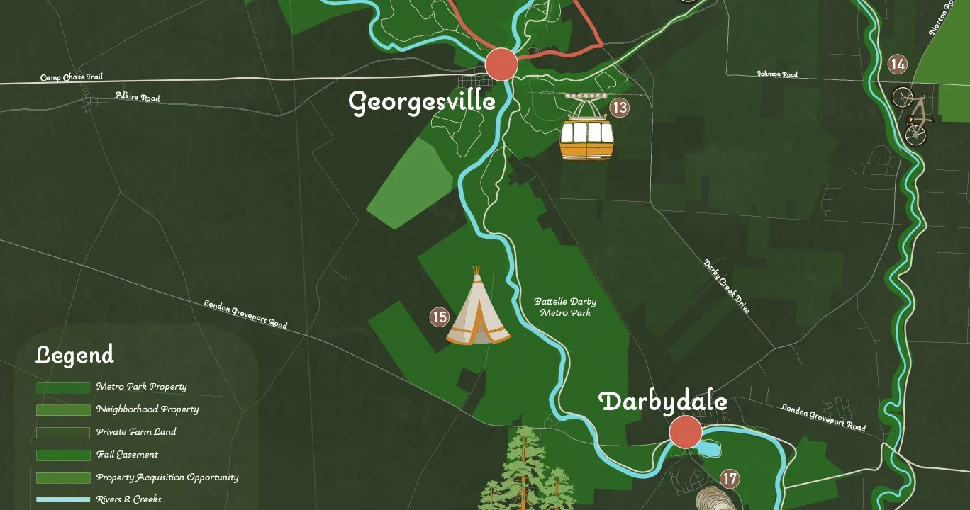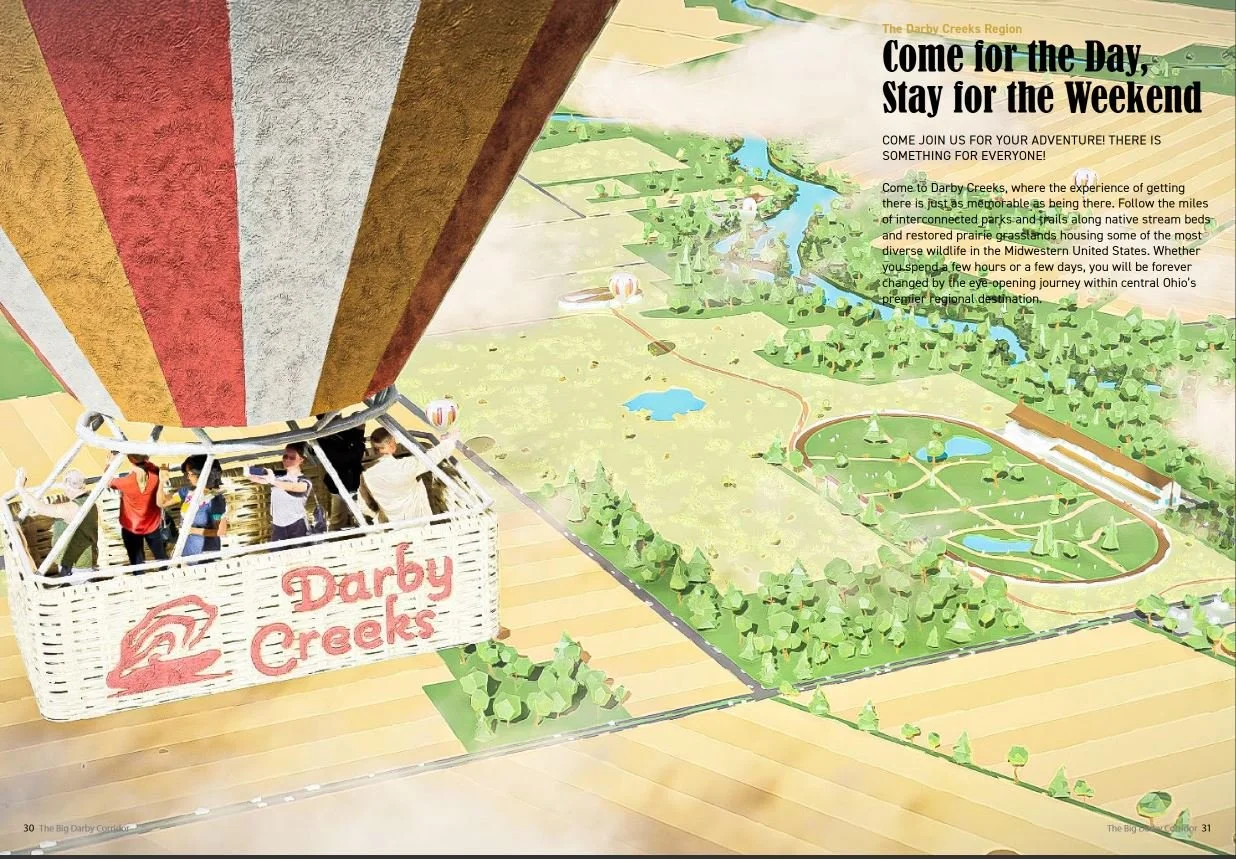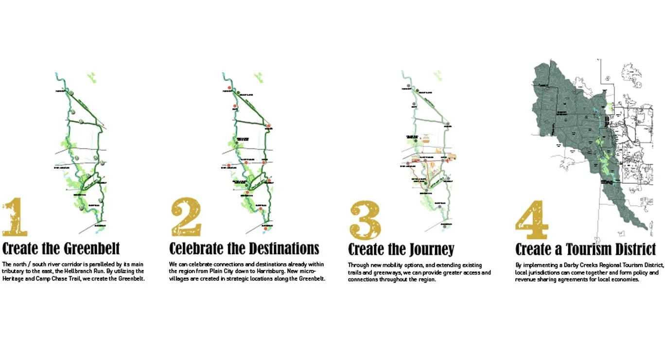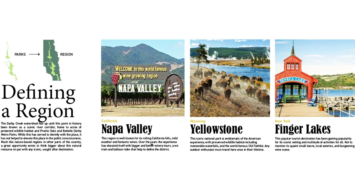REALM imagined the region as “Darby Creeks”, a journey that connected multiple destinations along the watershed, eventually becoming a tourism region. By connecting to existing Metro Parks, farms, trails, and transportation infrastructure, the region could flip its identity to one of exploration and adventure. Through the connection of these spaces and the addition of more unique experiences to the region, REALM imagines Darby Creeks as becoming an economic booster, but also a step in creating green-gray connections that created a new standard for sustainable tourism.