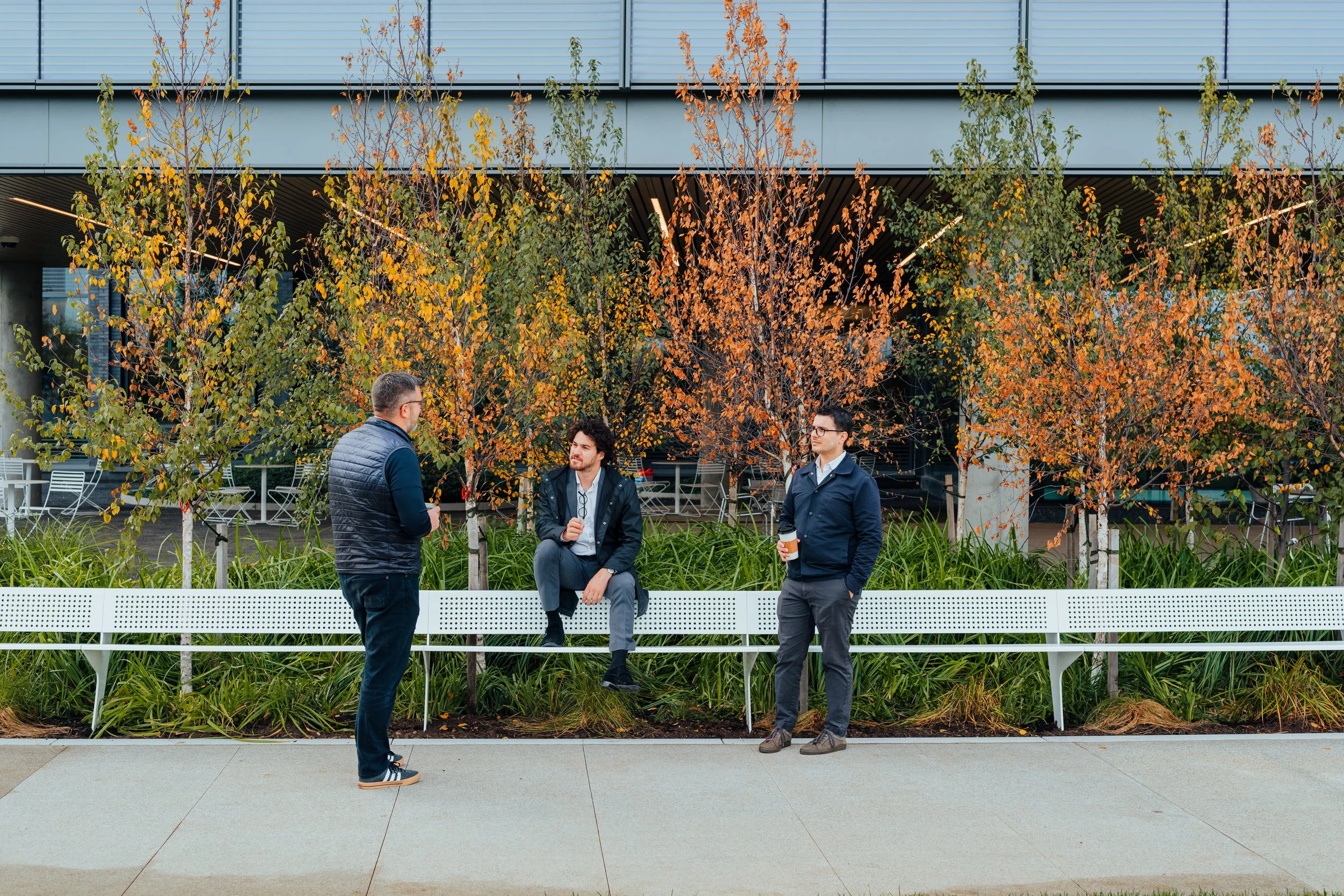 The design: The bench itself is light in nature, seemingly coming out of the plantings behind them, covered by the shade of newly planted birch trees. The sense of floating creates a comfortable, approachable space to read, eat lunch, or chat with a colleague. It serves as a beacon to watch activity going on within the plaza, sitting along the edge of the activated spaces around the campus.